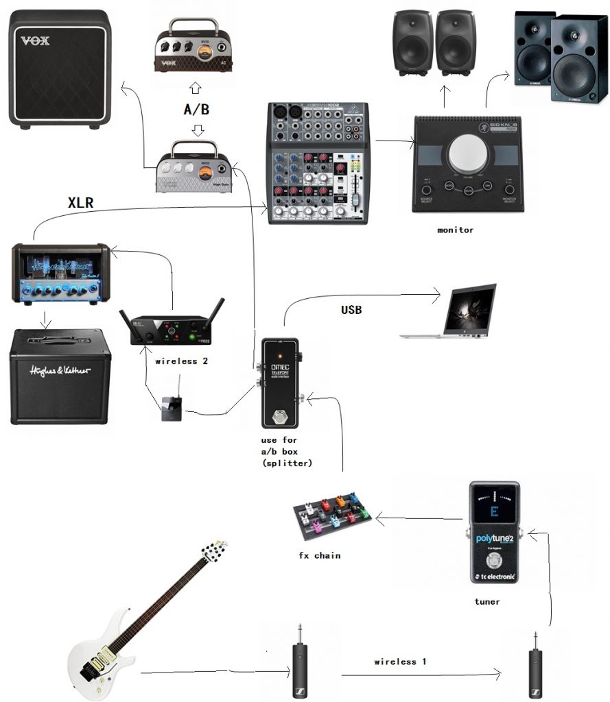 1:系统里面用了两套无线,一套是吉他给表,一套是a/b输出给远处(手够不着)的那个箱头。