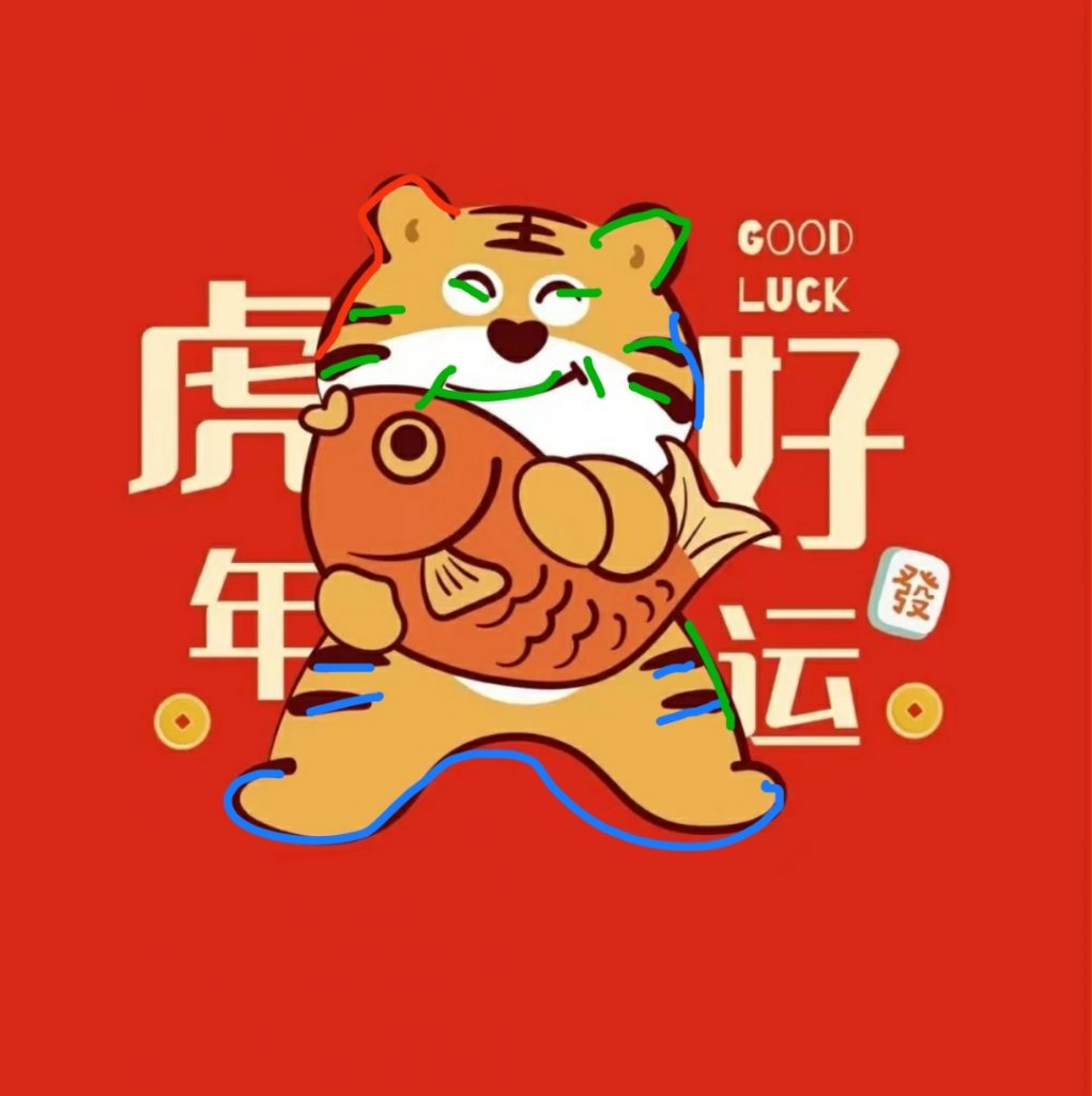 4:还有一个明显的疑点是:右上的英文。为什么左边就没有呢?这不对称,明显不合理。哪怕你不知道“虎年”应该怎么翻译,或者觉得“Year of Tiger”会破坏对称——从前我也见过这类年画,直接把“X年“写成“New Year”,一样看起来很工整。